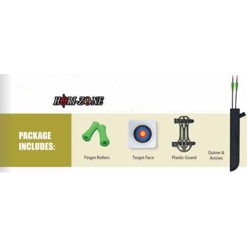 Package includes: Front sight pin, Plastic guard, Hip quiver, 2 Fiberglass arrows, Target sheet and Installed string finger rollers.