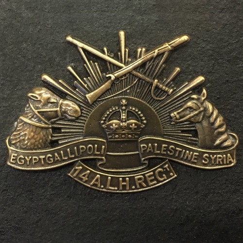 This is the badge that represents the 14th Battalion Australian Light Horse Regiment, The 14th Light Horse Regiment was a mounted infantry or light horse unit of the Australian Army. The unit takes its lineage from units raised as part of the colonial forces of the state of Queensland in 1860 and served during the Second Boer War and World War I. In 1930 it was amalgamated with the 2nd Light Horse Regiment to become the 2nd/14th Light Horse Regiment (Queensland Mounted Infantry), a unit that continues to exist as part of the Australian Army today.