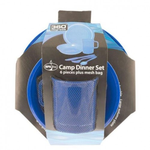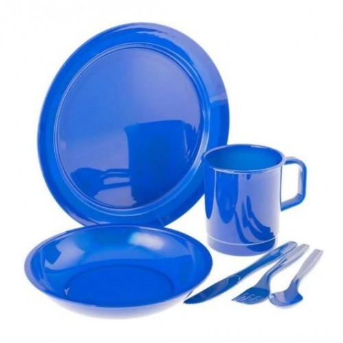 A strong and durable polypropylene dinner set: deep dish plate; large bowl; 550ml cup; knife; fork; spoon; and a handy mesh storage bag to keep it all tidy.